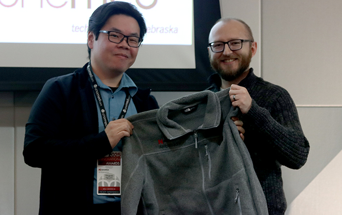The 2025 Faculty Entrepreneur Award recipient, Thanh Nguyen, accepts his award with brief remarks during UNeMed’s 2025 Innovation Awards ceremony, on Oct. 22 at the Scott Conference Center in Omaha.