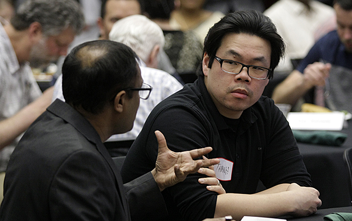 Sachin Pawaskar (left) and Thang Nguyen chat shortly before UNO's IS&T...