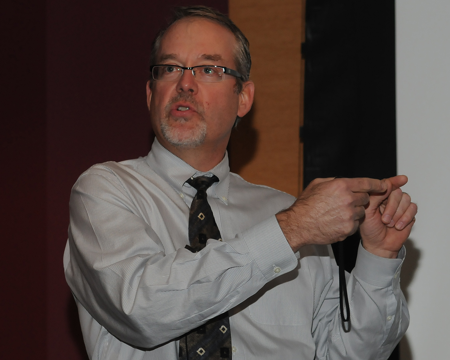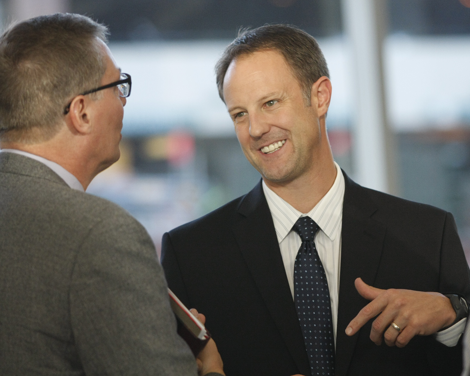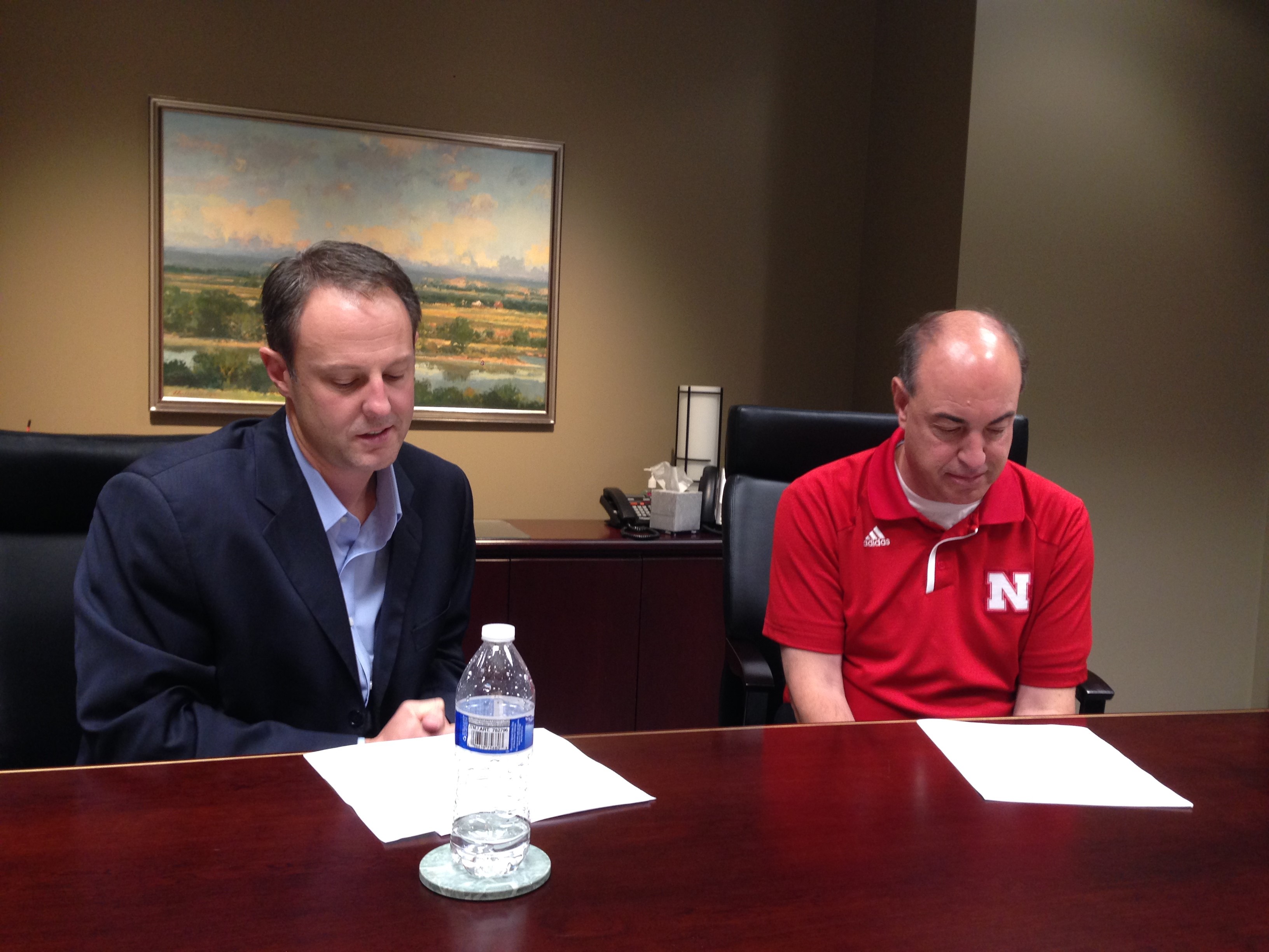 UNeMed President Michael Dixon (left) looks over his notes during his halftime...